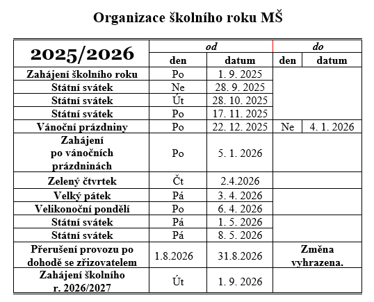Organizace školního roku 2025-2026 MŠ 1Stáhnout PředchozíOrganizace školního roku 2024-2025DalšíProjekt „Pěšky do školy“